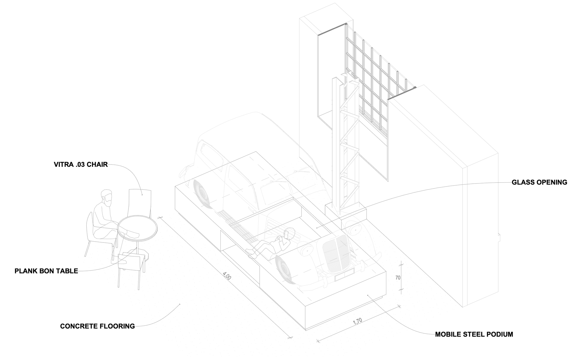 The tallest podiums showcasing the vehicles feature glass-covered tunnel openings, providing a unique view of the vintage cars.