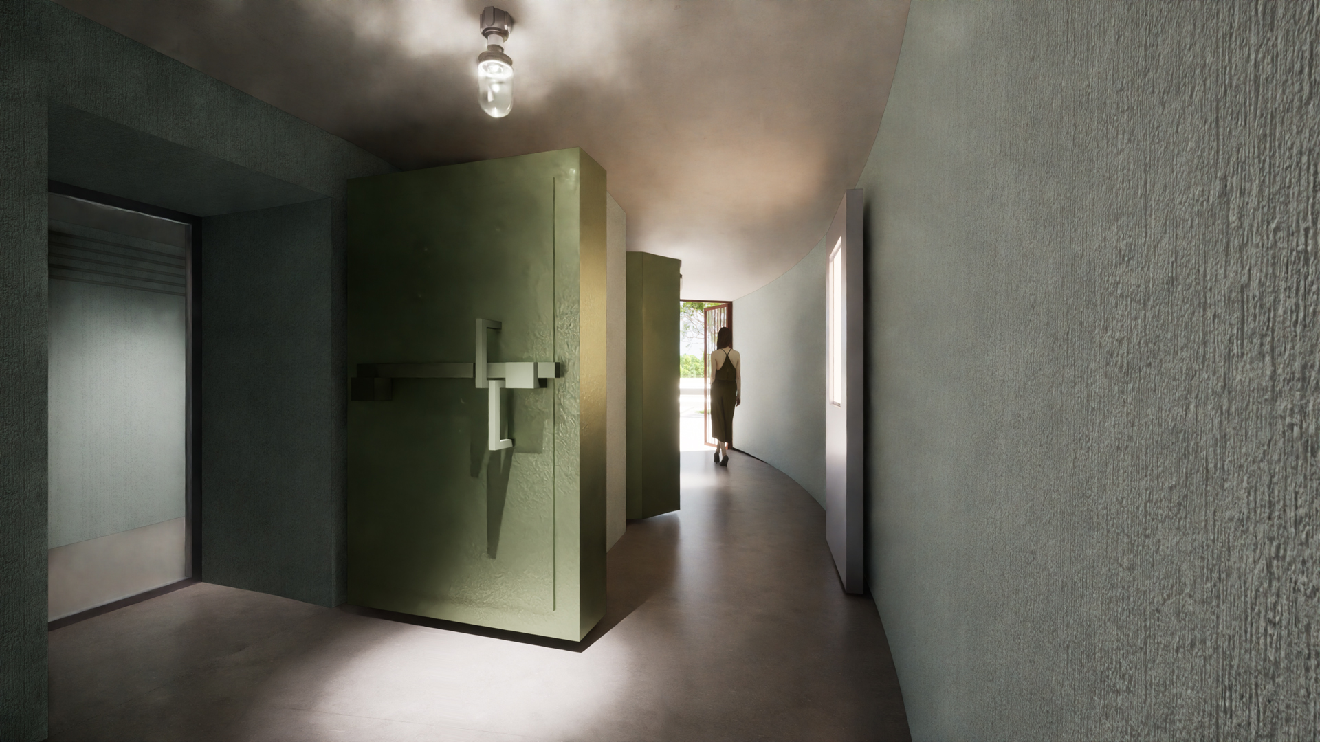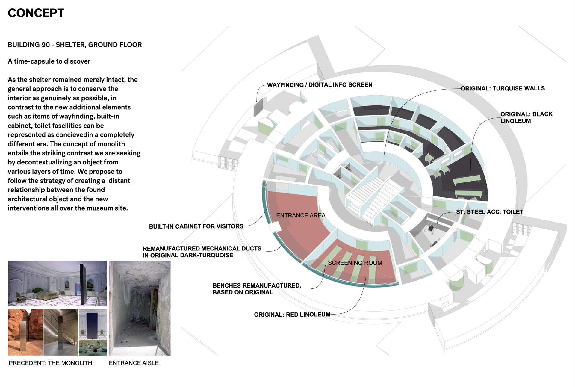 As the shelter remained mostly intact, the general approach was to conserve the interior in its original state as faithfully as possible. In contrast, the new additional elements such as items of wayfinding, built-in cabinet, toilet facilities can be conceived to evoke a completely different era. The concept of ‘monolith’ entails the striking contrast we are seeking by decontextualizing an object from various layers of time. We propose to follow the strategy of creating a distant relationship between the found architectural object and the new interventions throughout the museum site.