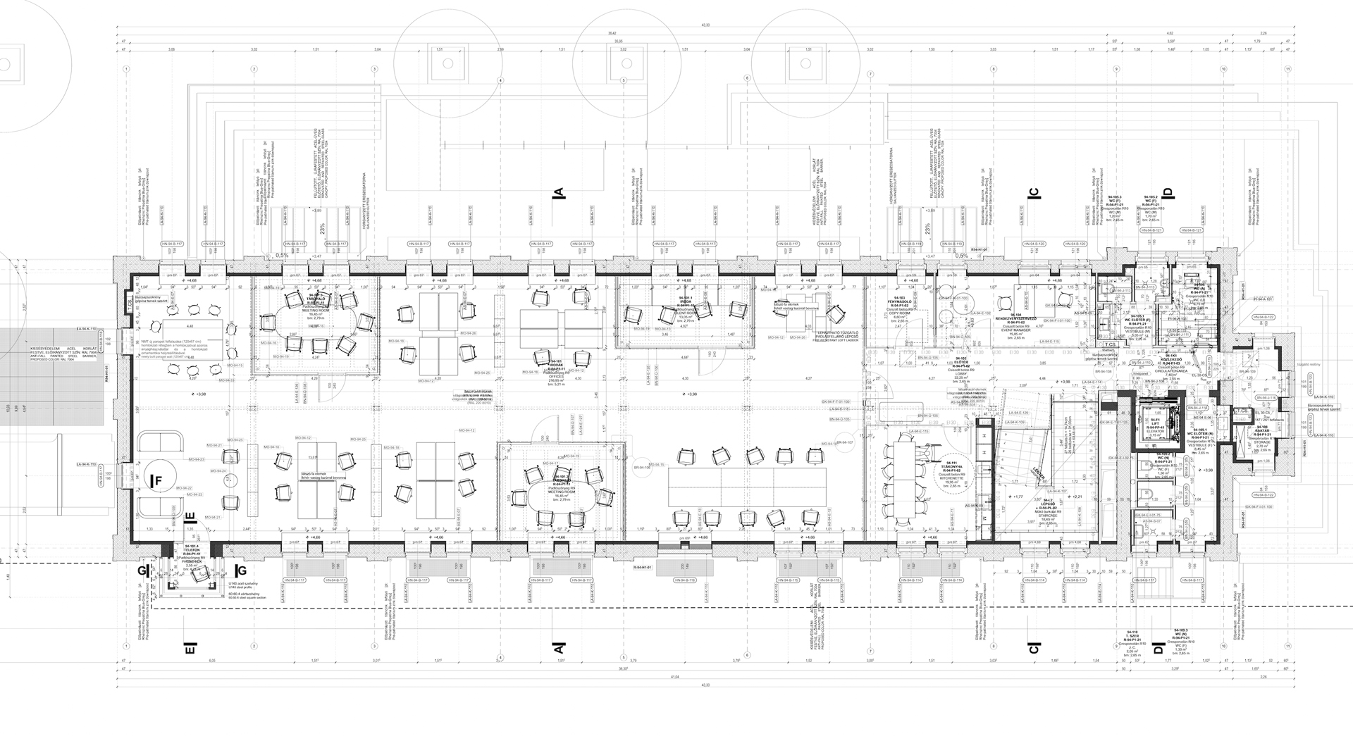 On the upper floor, our aim is to create a serene yet invigorating open office environment, using gentle shades for larger areas and introducing vibrant colours through furnishings. Enclosed silent and meeting rooms feature frosted glass and solid ceilings with acoustic treatment, suspended below wooden trusses.