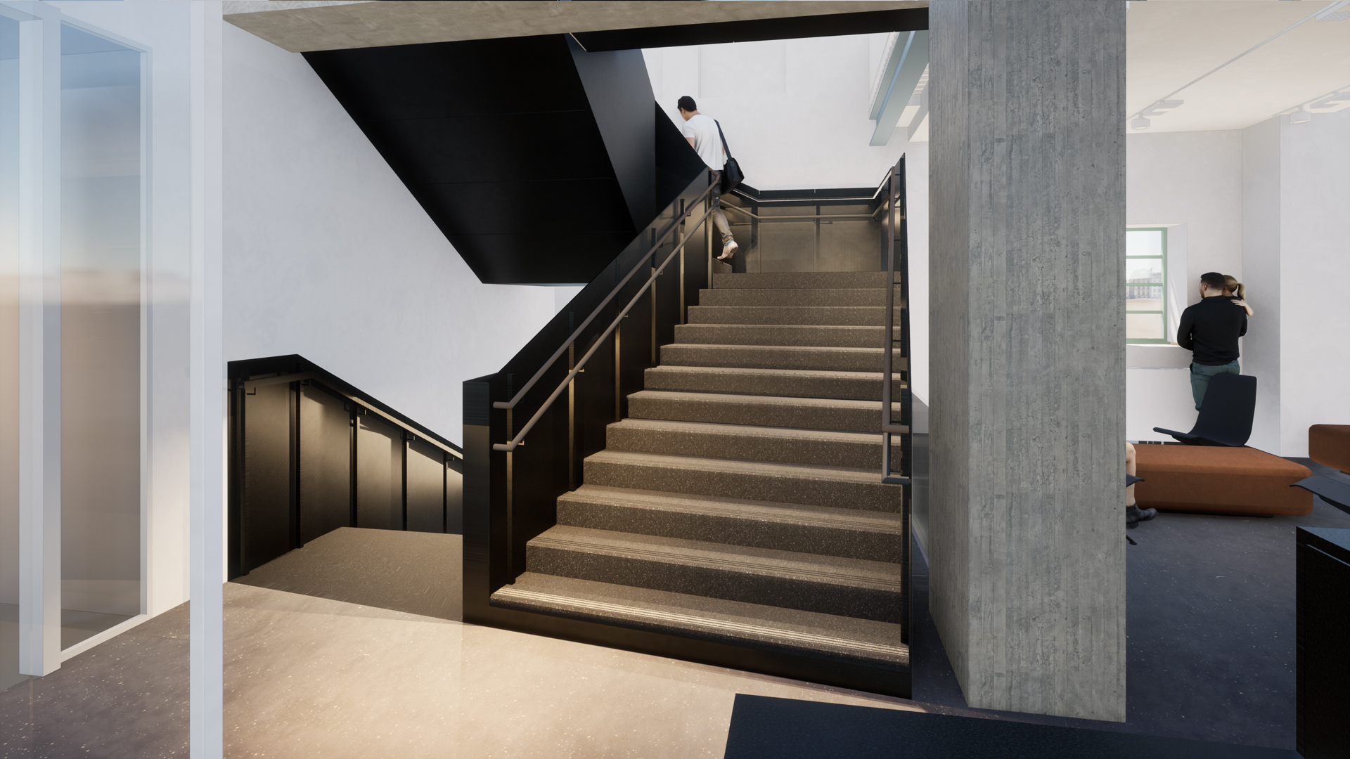 The most distinctive element of the interior, the meandering inspection pit, will be for the most part covered up due to the change of function. Therefore, we want to indicate the former pit outline by different floor colorings within the continuous epoxy surface. We believe that simple and pragmatic furnishings are appropriate for both the smaller restoration workshops and the assembly hall. In terms of interior design, we strive for the material choices and colouring that refer to the current state of the building, such as the assembly pit and industrial gate - the walls are light, the ceiling is given a dark shade.