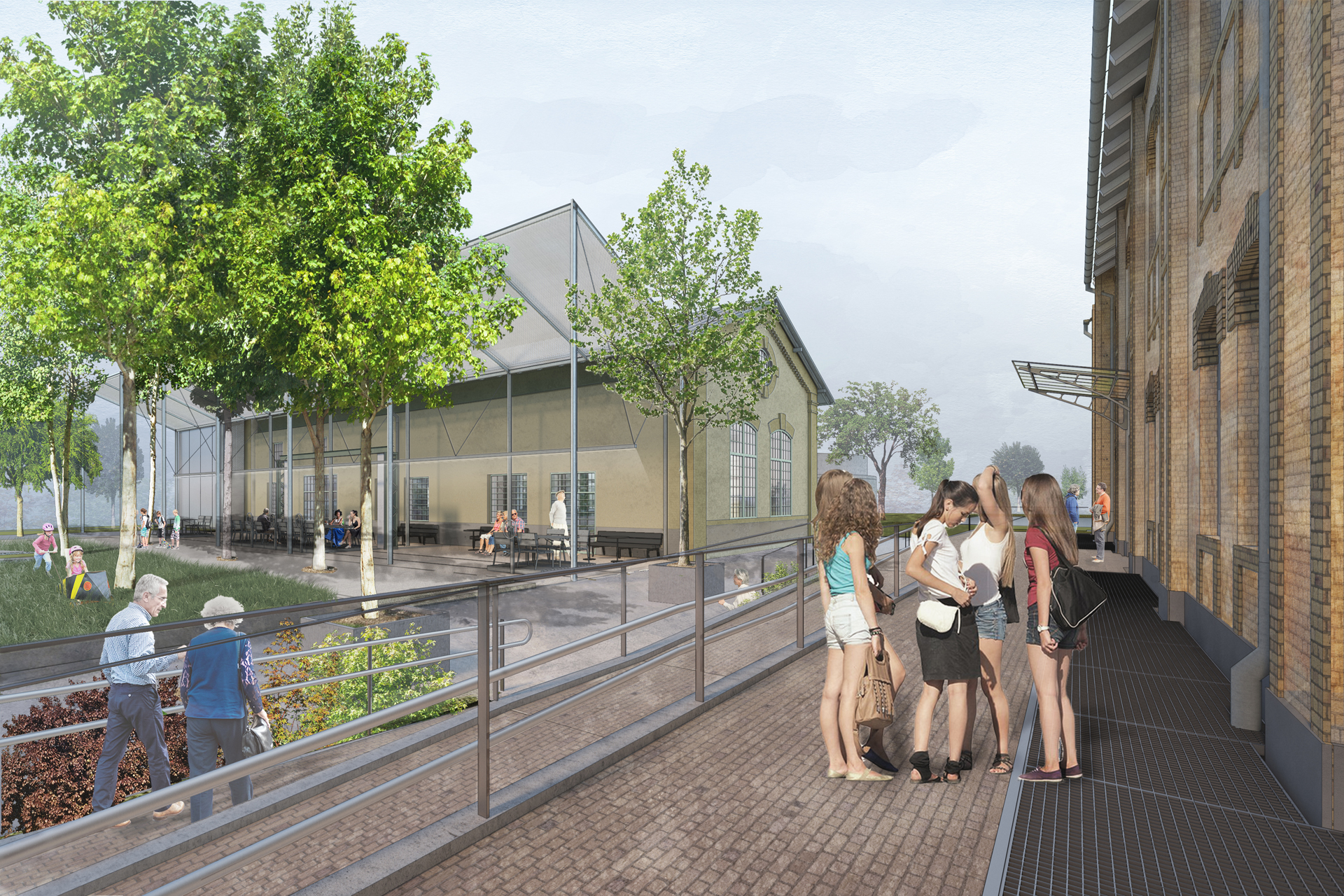 The first phase of the revitalization project, known as the ‘Small Campus,’ serves as an introduction to the main program incorporating four listed industrial heritage buildings in the north-east corner of the site. The architectural concept, which required a careful approach to integrate the new design elements with historical buildings, involves adding metal-clad ‘ghost houses’ to the existing structures, creating a subtle shimmer within the post-industrial landscape.