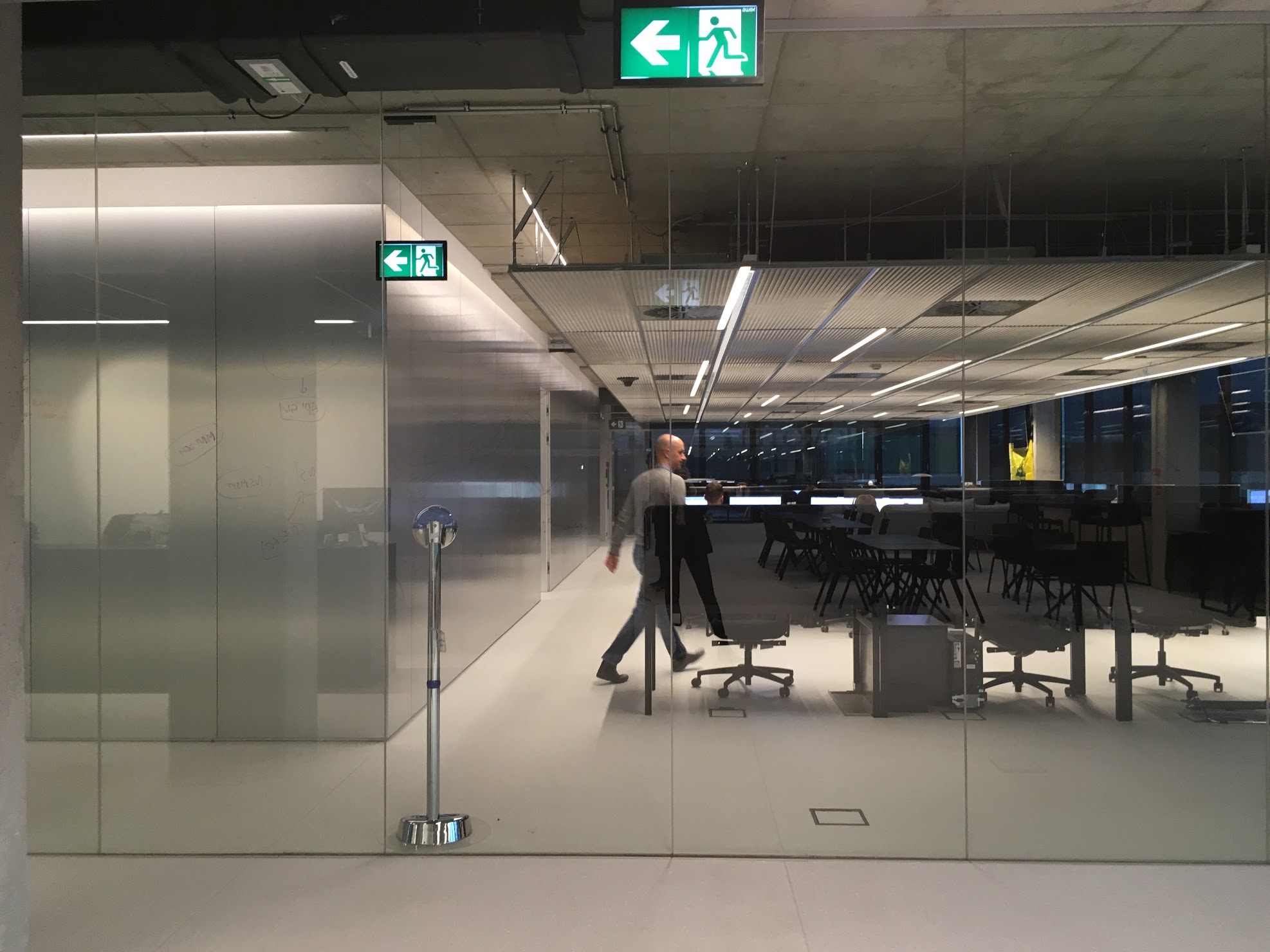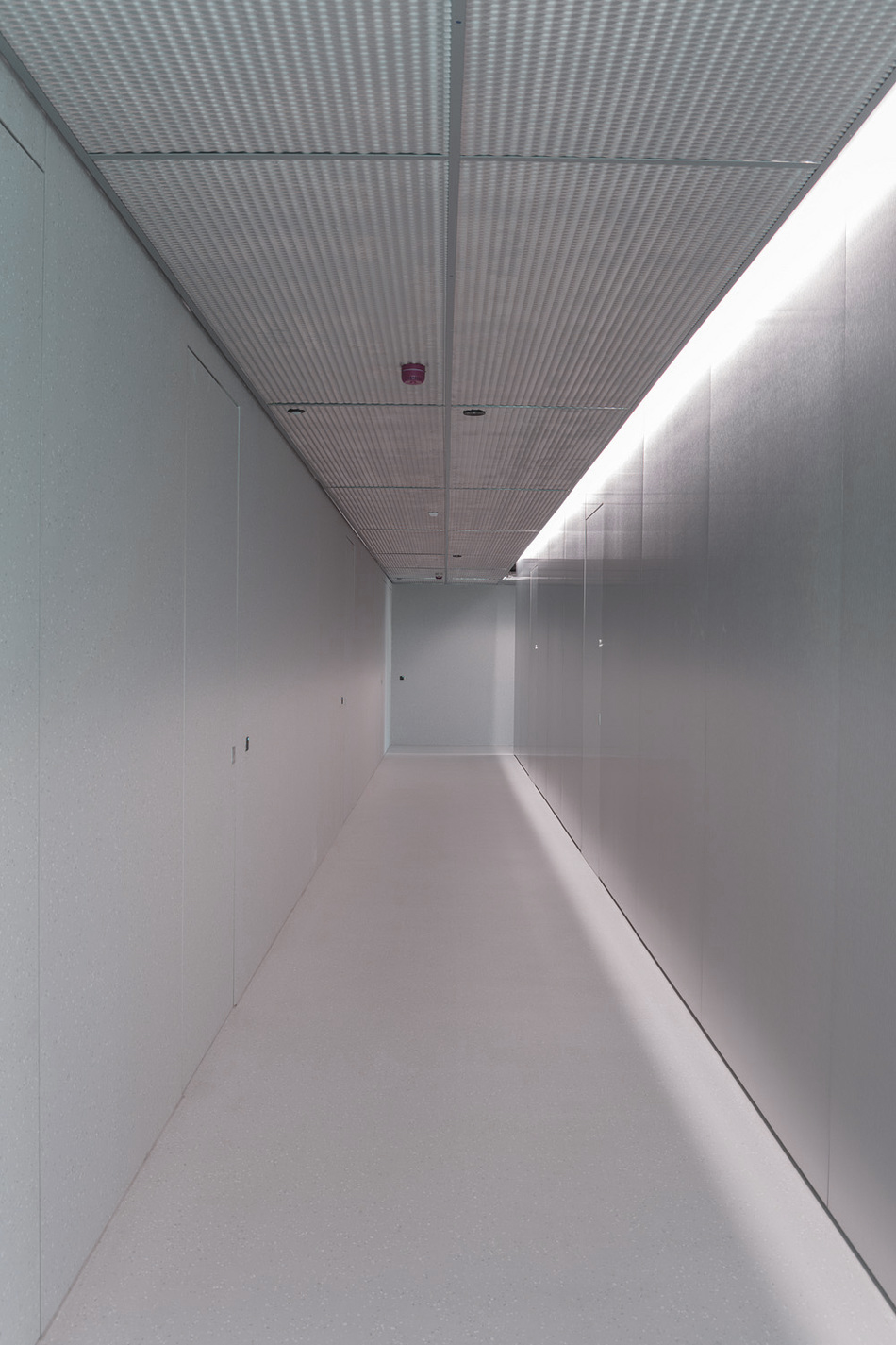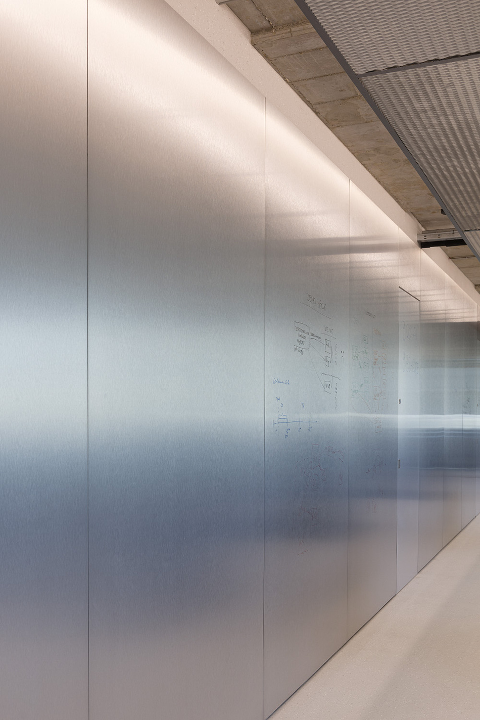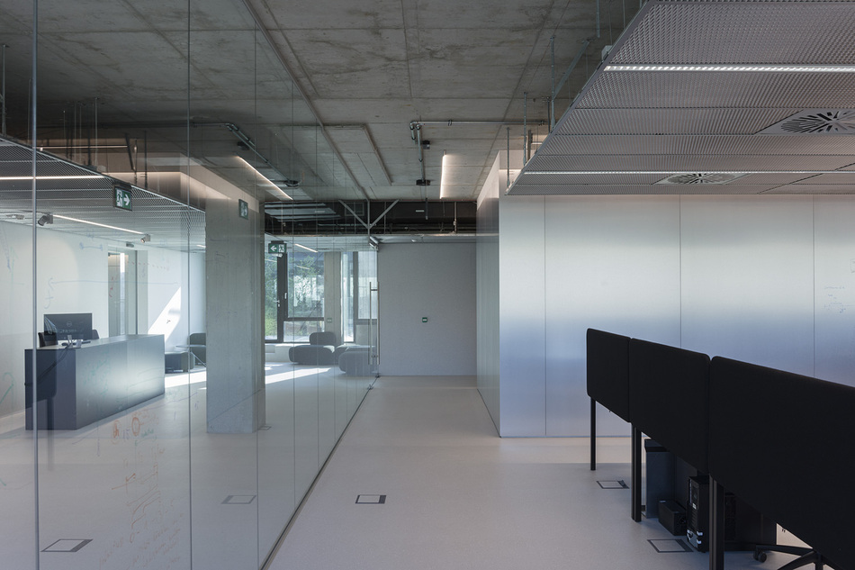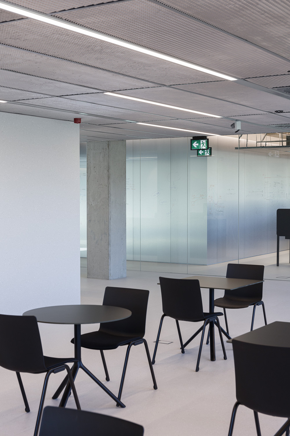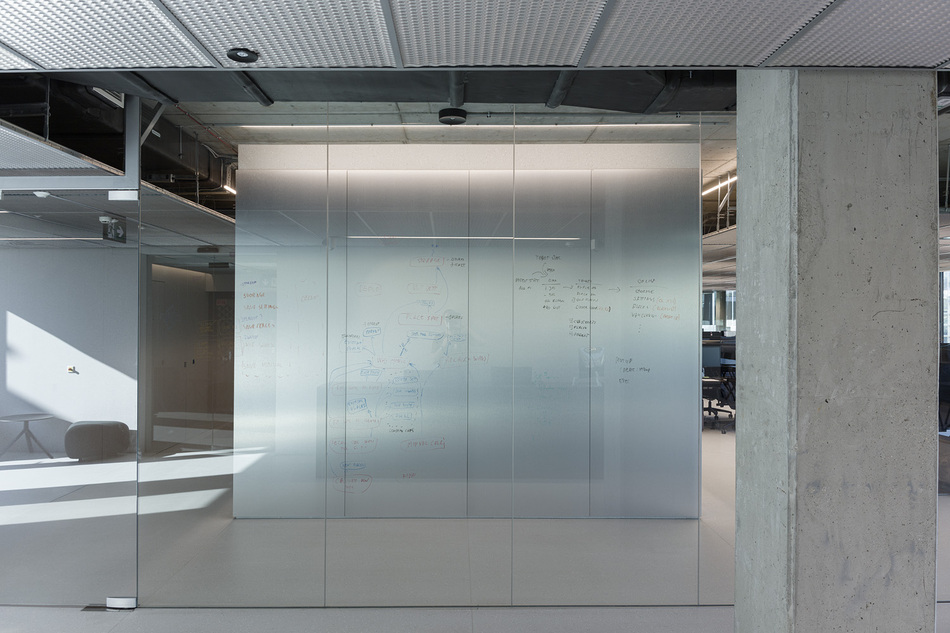 In addition to its object presence it has a number of tasks: it structures the space, dims the dark areas of the middle corridor and its writing surface supplies the IT team with an infinite whiteboard.︎︎︎Clusters of executive, multifunctional hall and the open scrum space