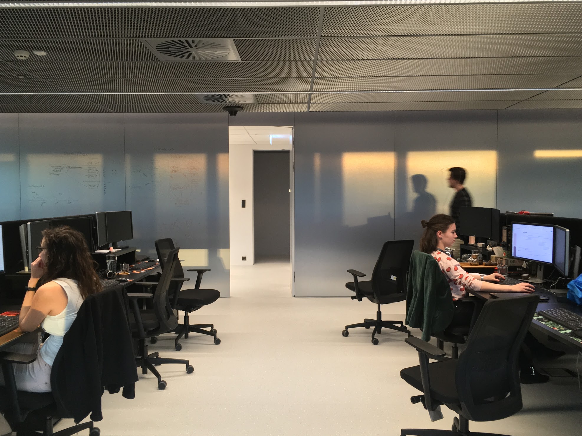 The layout of the 650 m² office space of an tech startup is arranged around the framework of the pillar structure of the office building, located between the rental property entrance, terrace, and restroom facilities. Our duo was challenged to keep the architectural structure's integrity along the recurring design tasks of the client.